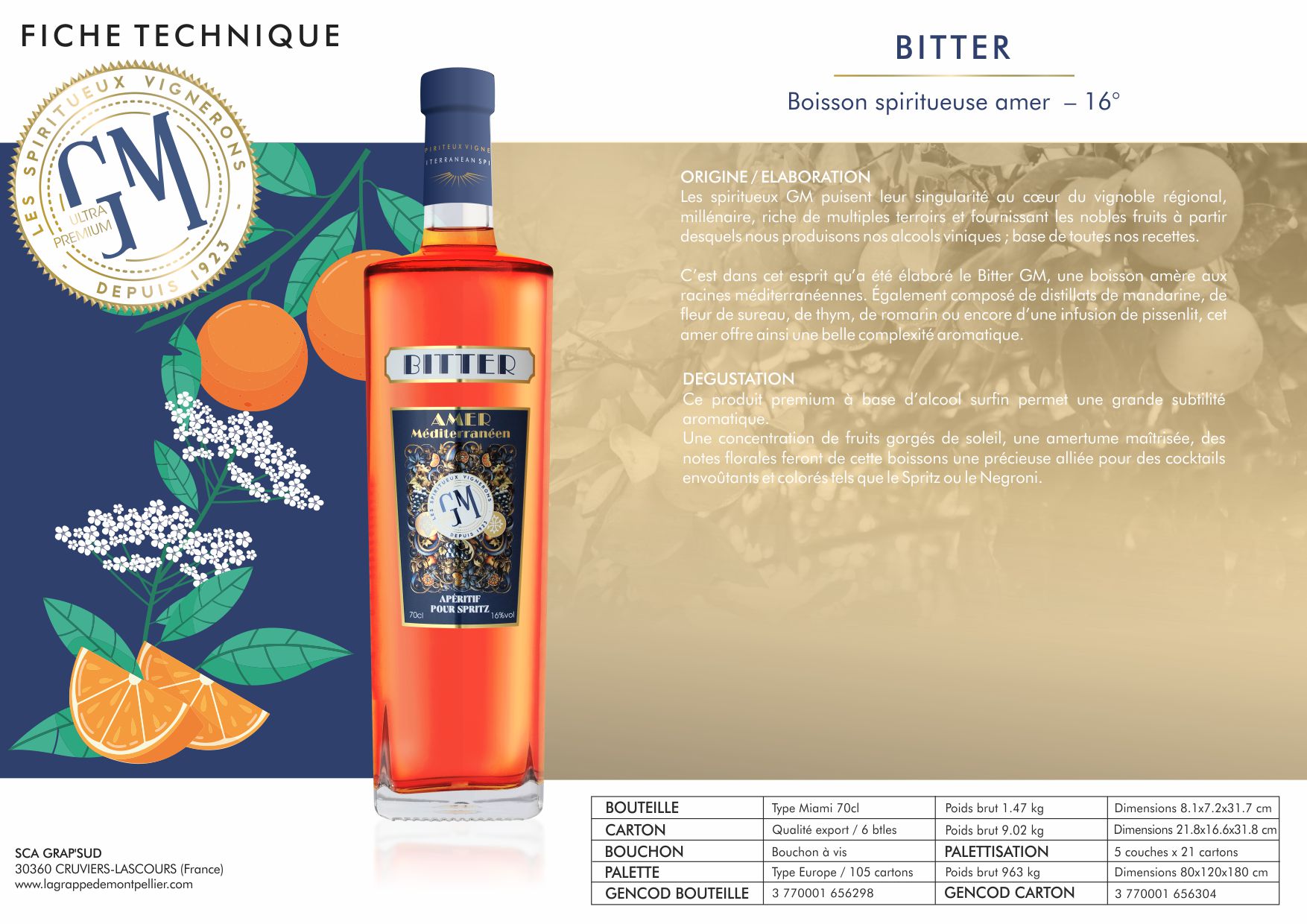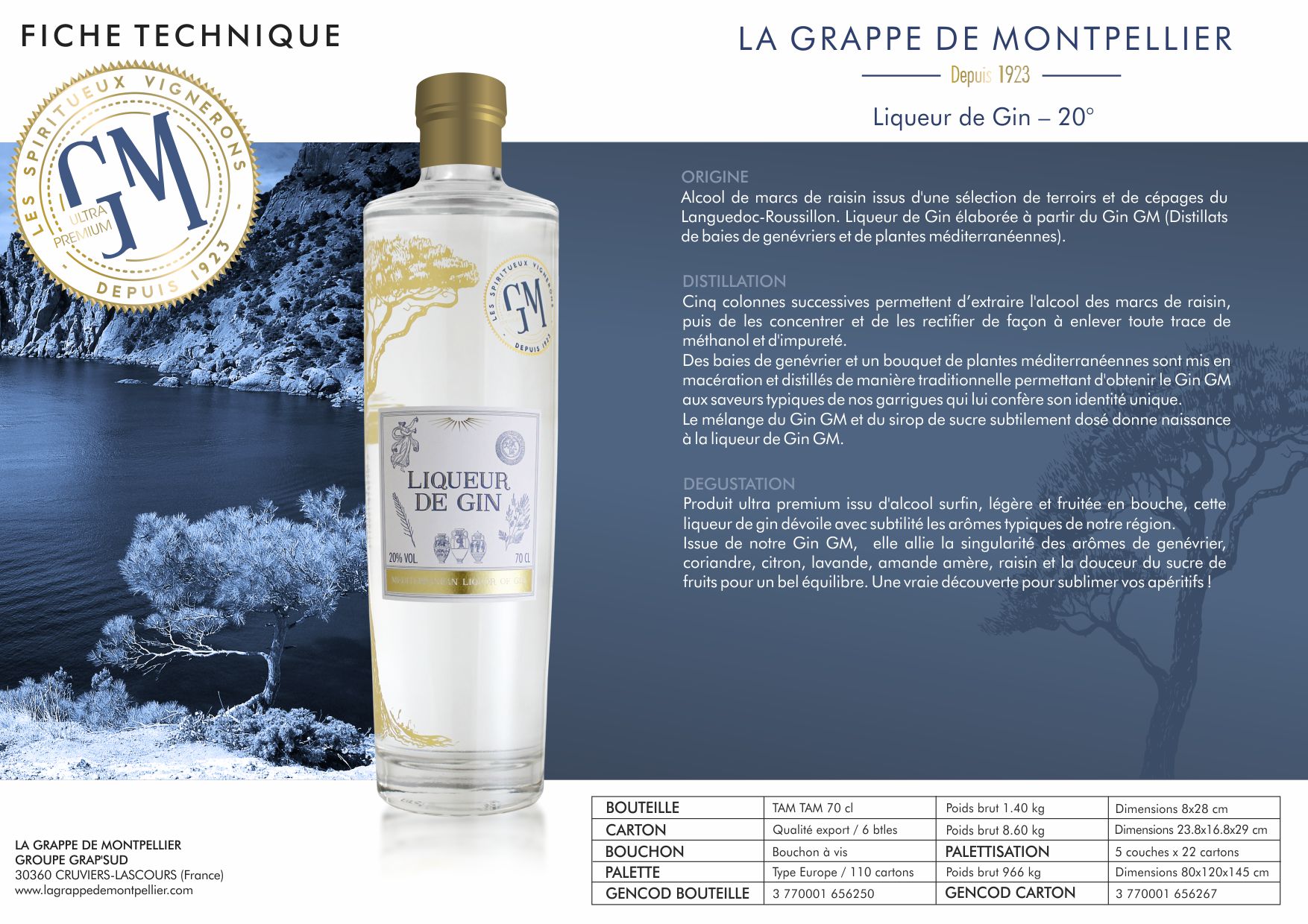 La distillerie La Grappe de Montpellier, située sur les bords de la mer Méditerranée, distille depuis 1923 les marcs de raisin des grands domaines viticoles locaux. Comme l’ensemble des distilleries du groupe Grap’Sud, elle est implantée sur son territoire au plus près des vignerons. Ce maillage de distilleries implantées aux quatre coins de la région Languedoc-Roussillon permet de disposer d’une grande variété de cépages marqués par leurs terroirs. Forte d’un esprit d’innovation et de nouvelles techniques de distillation, la distillerie continue d’écrire l’histoire des spiritueux régionaux aux côtés du groupe Grap’Sud auquel elle est rattachée. A travers sa gamme de spiritueux, la marque GM se veut l’ambassadrice d’un territoire vigneron, d’un savoir-faire historique en matière de distillation de marc de raisin. Raffinés et aromatiques, les spiritueux GM ne cessent de faire des émules auprès d’une clientèle jeune et sophistiquée autant qu’auprès d’une cible de consommateurs épicuriens à la recherche de produits haut de gamme à forte identité.
